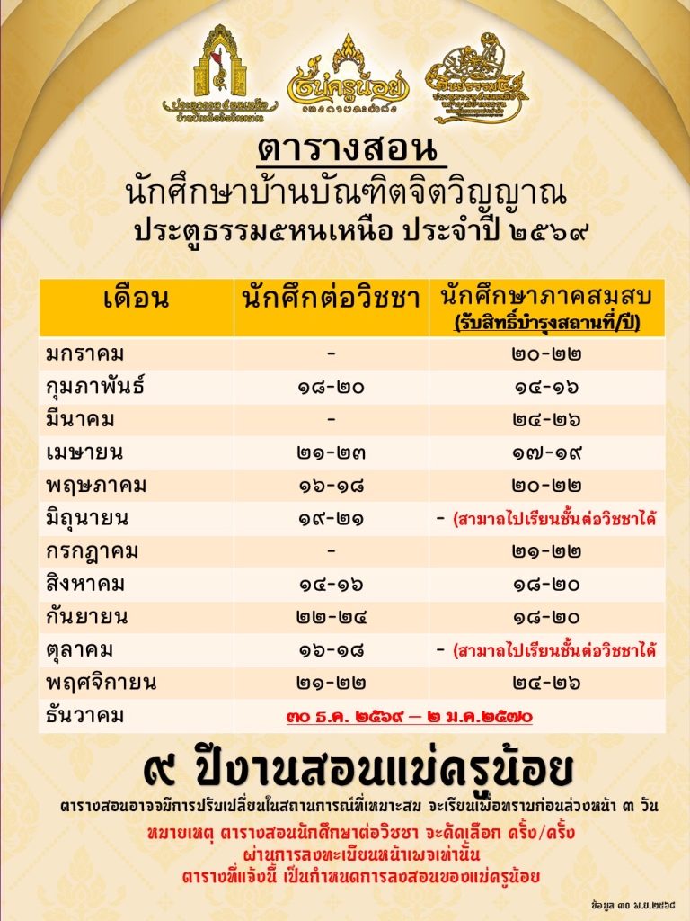 ตารางเรียนต่อวิชชาประจำปี 2569 นักศึกษาบ้านบัณฑิตจิตวิญญาณ