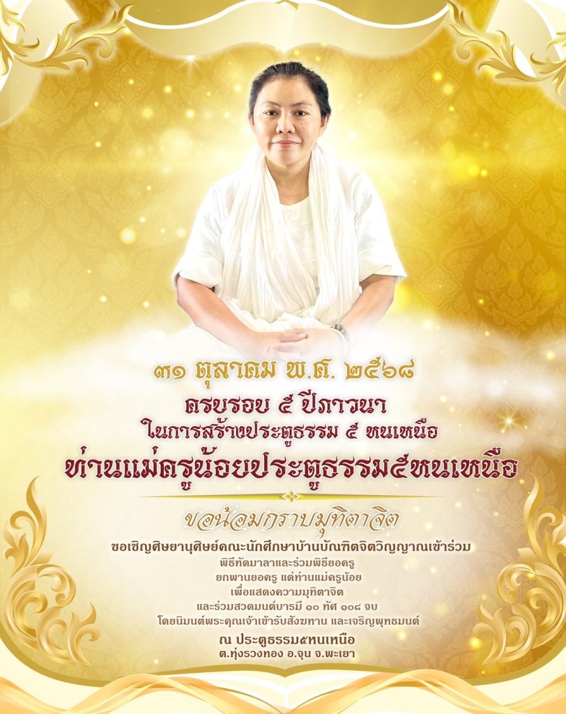 ๓๑ ตุลาคม ๒๕๖๘ น้อมกราบมุทิตาจิตถวายแด่ท่านแม่ครูน้อย ประตูธรรม๕หนเหนือ เนื่องในวันครบรอบ 5 ปีภาวนา